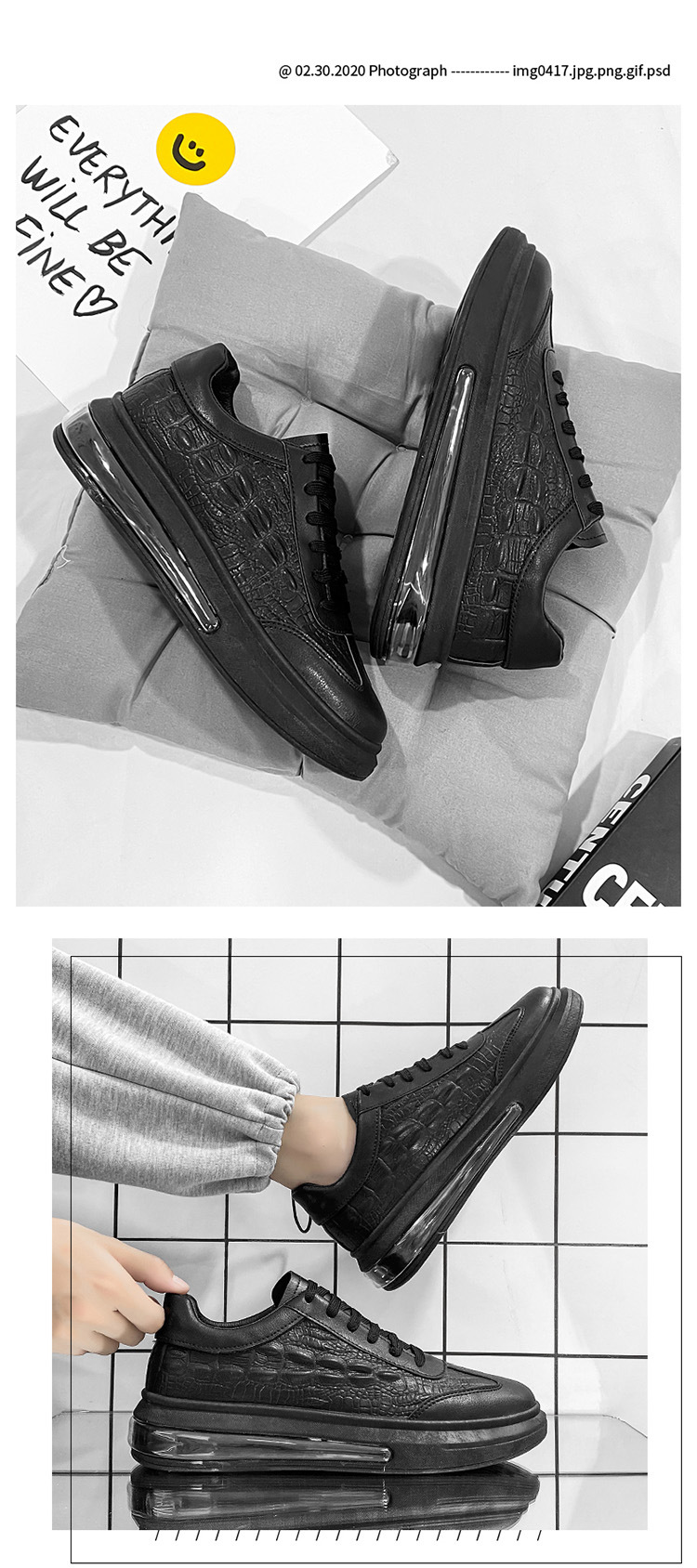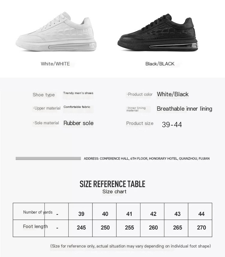 היכנסו לעונה בביטחון ובסטייל בנעלי הגברים הקז'ואל החדשות שלנו, שנועדו לשדרג את המלתחה שלכם תוך מתן נוחות שאין שני לה. הקולקציה שלנו כוללת טכנולוגיית כרית אוויר חדשנית, המבטיחה שכל צעד שתעשו ירגיש קל ותומך. עם עיצוב אלגנטי בצבע אחיד , נעליים אלו מושלמות לכל אירוע, בין אם אתן הולכות לשיעור או נהנות מיום כיף עם חברים. חומר המיקרופייבר העליון מבטיח עמידות ומראה מודרני, בעוד שצורת האצבעות העגולה מספקת שפע של מקום לנשימה לרגליים. נעליים אלו זמינות בשתי אפשרויות צבע קלאסיות, GB08 לבן ו- GB08 שחור , במגוון מידות (39 עד 44) כדי להבטיח התאמה מושלמת לכולם. עיצוב העקב הנמוך (1-3 ס"מ) לא רק מוסיף דחיפה עדינה לגובה אלא גם משפר את היציבה הכללית שלך. כל זוג מעוצב עם סוליה עבה המציעה אחיזה ויציבות מעולות, מה שהופך אותם לאידיאליים הן ליציאות יומיומיות והן ללבישה יומיומית. צפו בתמונות המדהימות למטה כדי לראות את הנעליים בפעולה: