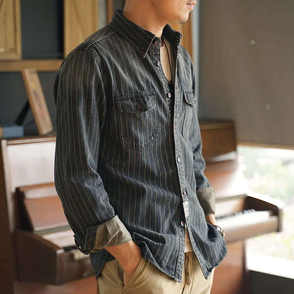 Discover the perfect blend of style and comfort with our Retro Heavy Striped Denim Shirt. Crafted from pure cotton, this long-sleeve casual men's coat combines vintage charm with modern functionality. The fabric is not only machine washable but also wear-resistant and high in color fastness, ensuring that your shirt looks great wash after wash.